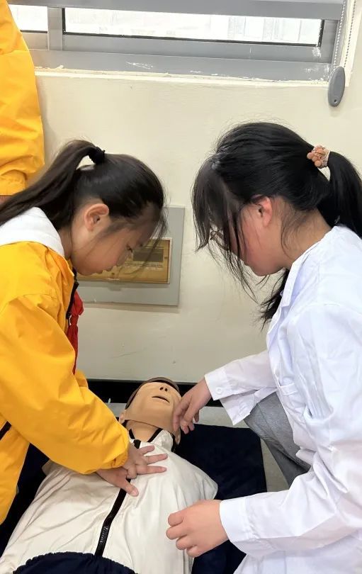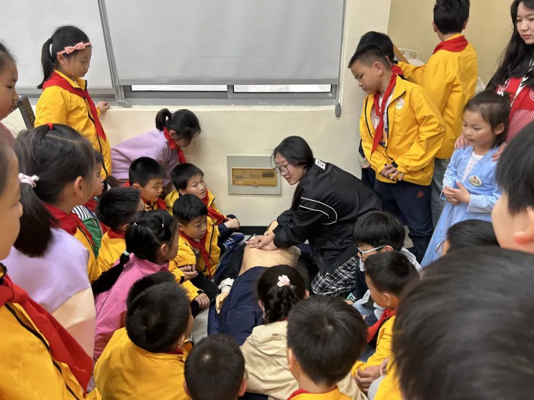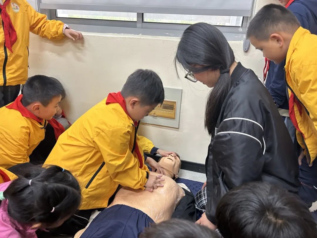 在健康管理实训中心,队员们成功地完成了人生中第一次“抢救”。“一个人心脏骤停3分钟就会出现脑水肿、4-6分钟就可能出现脑细胞不可逆性损伤,抢救黄金时机只有4分钟!”志愿者姐姐向队员们讲解心肺复苏的内容、意义及其重要性,并示范了心肺复苏和自动体外除颤仪(AED)的使用方法与步骤。队员们跃跃欲试,争相参加操作模拟。“01,02,03……”队员们慢慢开始找准正确的位置和力道,保持一定频率,认真地练习按压。虽然是初次尝试,但大家都非常认真。