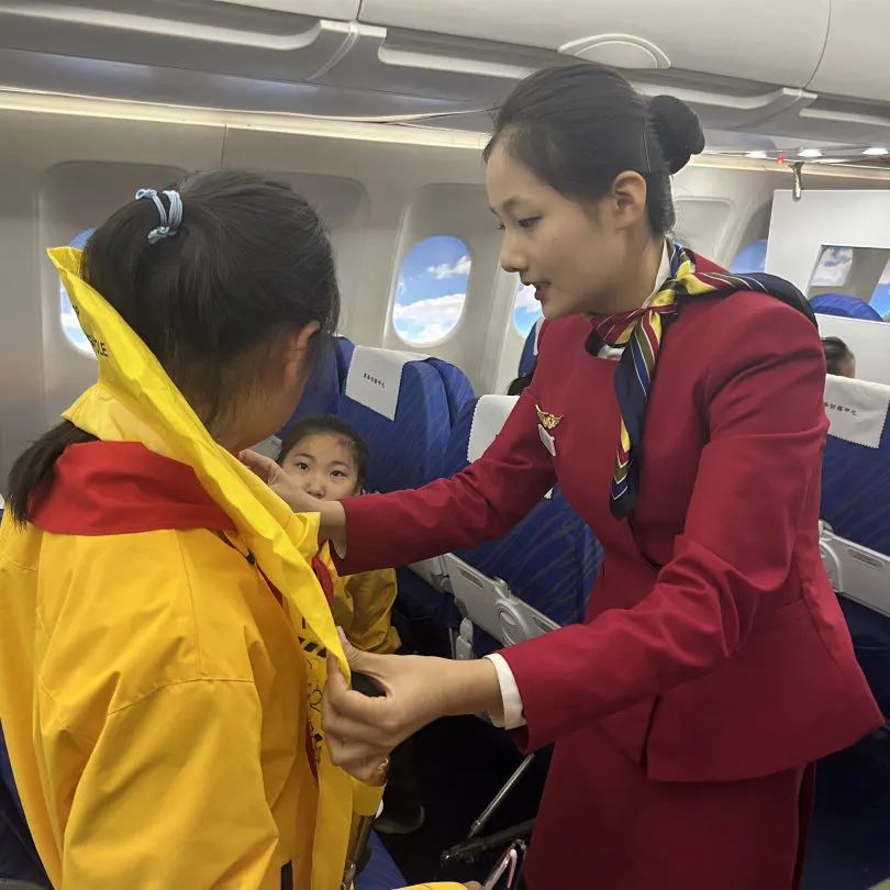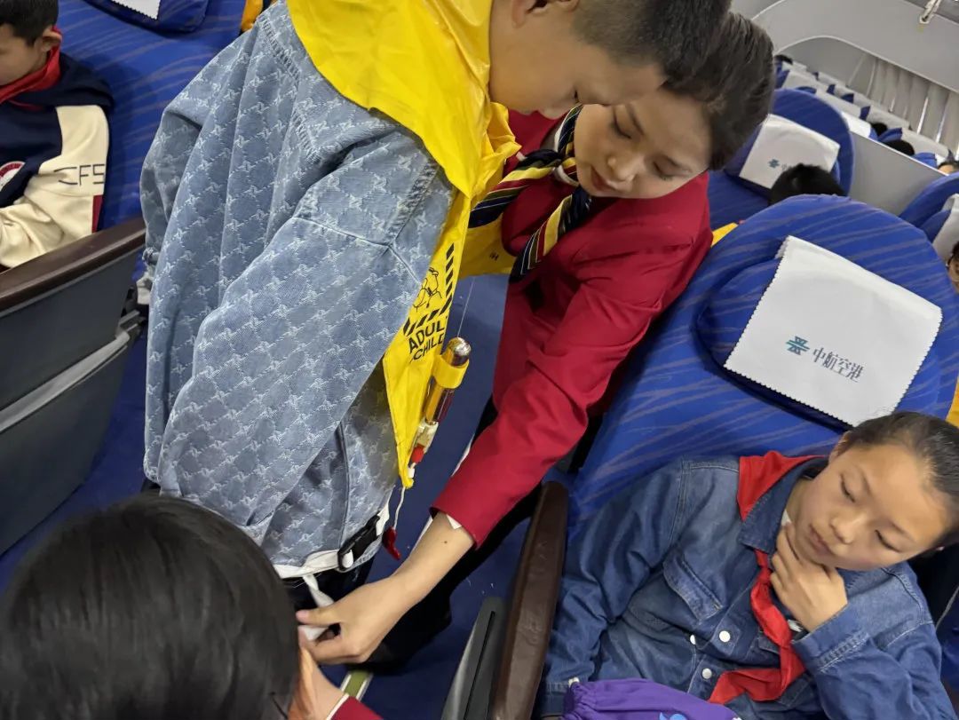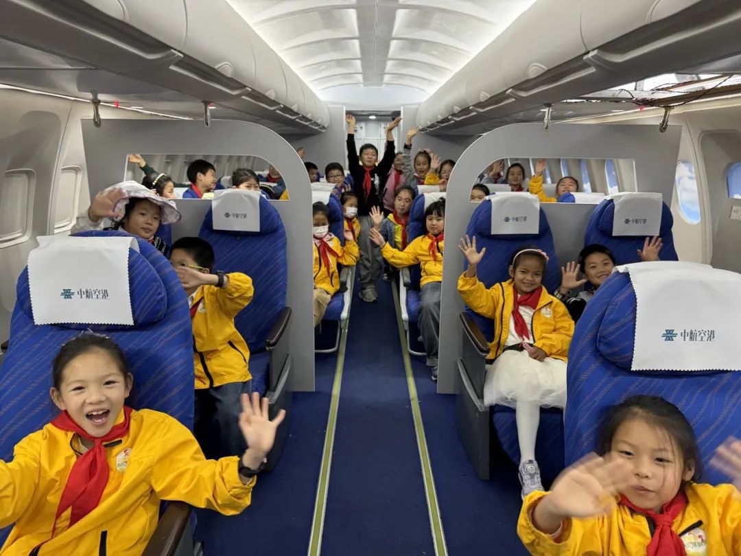 队员们首先参观了航空乘务训练中心,坐在1:1的大飞机里,亲身体验安全气囊的佩戴和遇到紧急情况如何疏导的方法。