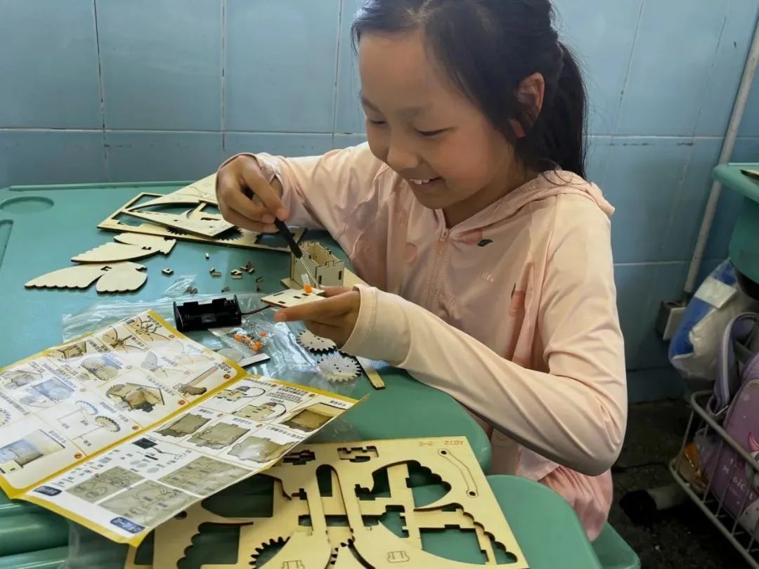 随着“快乐大篷车”的轮轴滚动,孩子们的热情被进一步点燃。他们将满腔热情投入到橡筋滑翔机的制作中,了解飞行原理;通过手摇发电机感受“动能到电能”转换的奇妙;小台灯的组装让孩子们理解了基本的电路原理;光纤灯的制作教会了他们光谱分解知识;八音盒的制作则是一次对声音美学和机械结构的发现之旅。