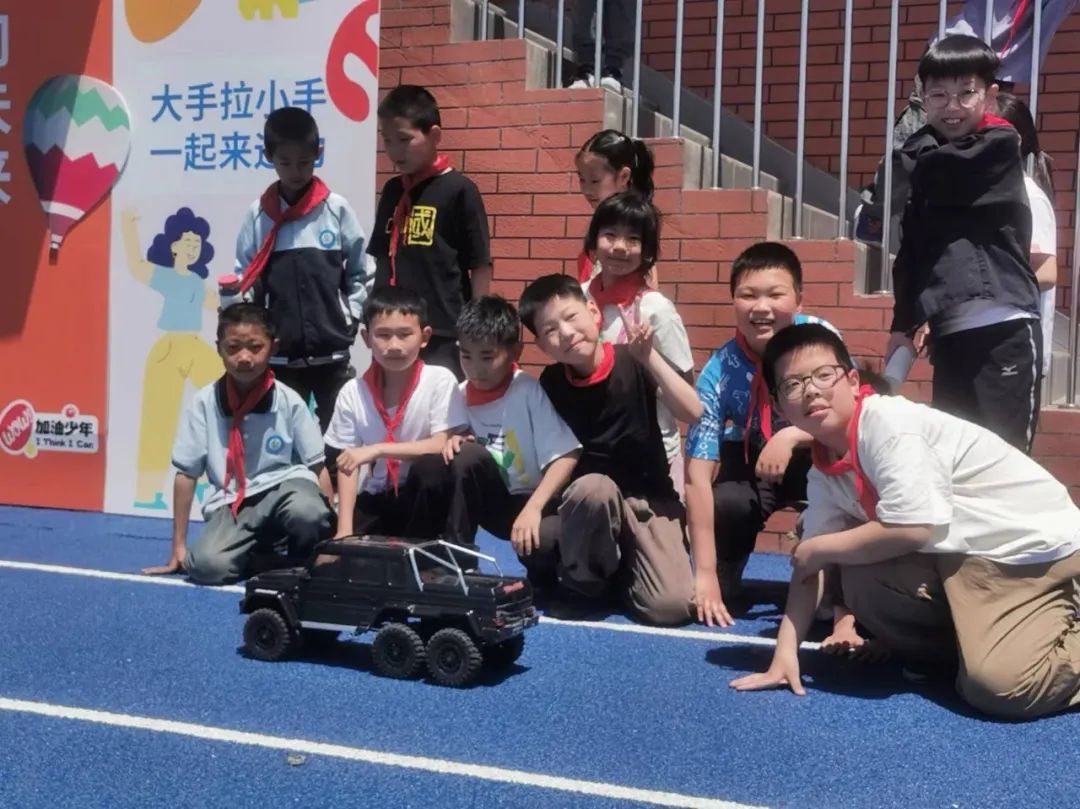 校园的绿茵场上热闹非凡,掌声和欢呼声此起彼伏。突然,一架小型无人机腾空而起,它的螺旋桨切割着空气,发出嗡嗡的声音,在空中划出一道道优雅的弧线。它时而高速俯冲,时而稳稳悬停,仿佛在空中跳着一支舞蹈,引得围观的同学们惊叹不已。几辆遥控车驶进跑道上,更是引起学生们的围观,在少年宫老师的操控下,转眼就到了场地中央,上演了一幕幕激情和速度的对决,驰骋、急停、加速、转弯、碰撞、翻越、直立前进……把整个活动推向了高潮。