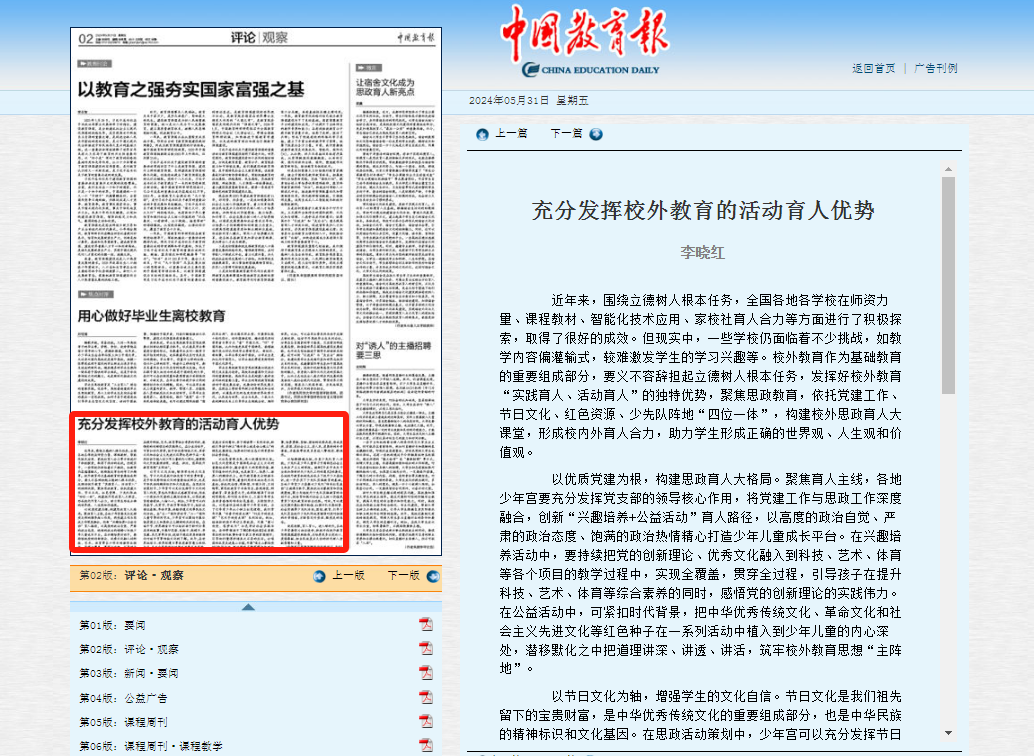 2024年5月31日,《中国教育报》第2版以《充分发挥校外教育的活动育人优势》为题,专题报道了无锡市少年宫开展思政教育铸魂育人活动的经验与成效。