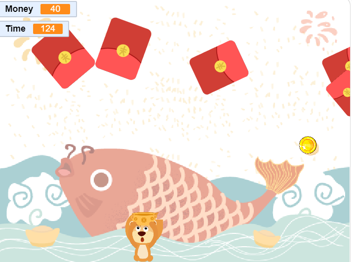 本节课学习克隆和事件指令,制作一个抢红包小游戏。通过按下键盘的左右方向键控制大头接住从天而降的幸运红包,千万小心躲开炸弹哦!