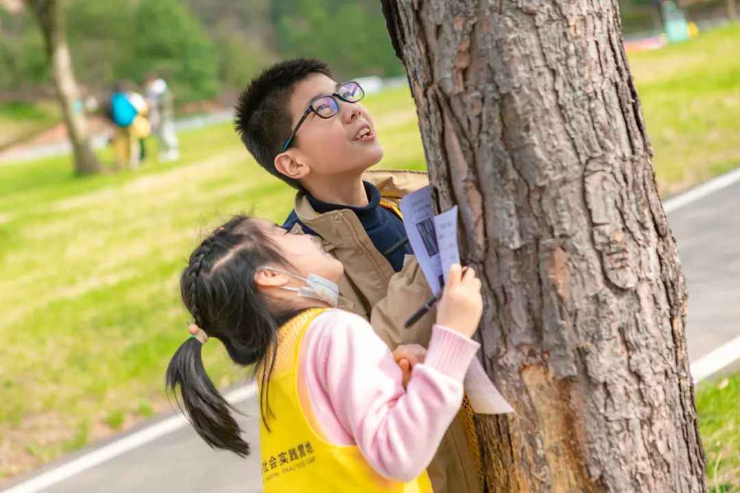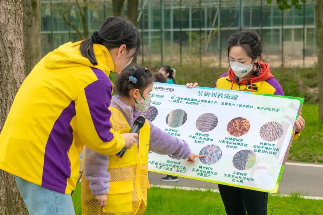 邀请少先队员们与大树交朋友,并对“朋友树”进行观察、寻找树皮纹理。