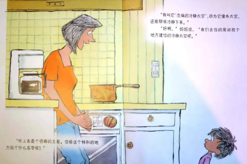 小男孩杰瑞因打碎为爸爸准备的生日陶碗而愤怒,后在妈妈的引导下,通过建立“冷静太空”学会了管理情绪。当你生气、难过时该怎么办呢?让我们一起来建立自己的“冷静太空”吧!