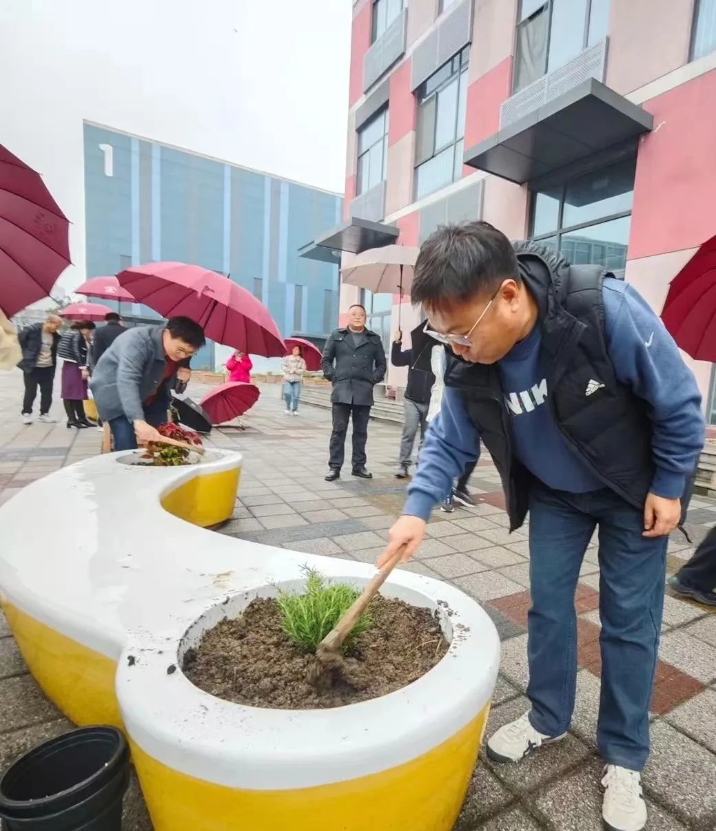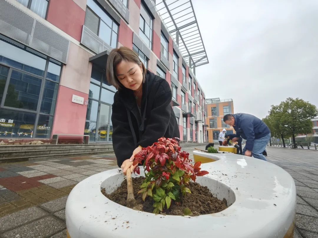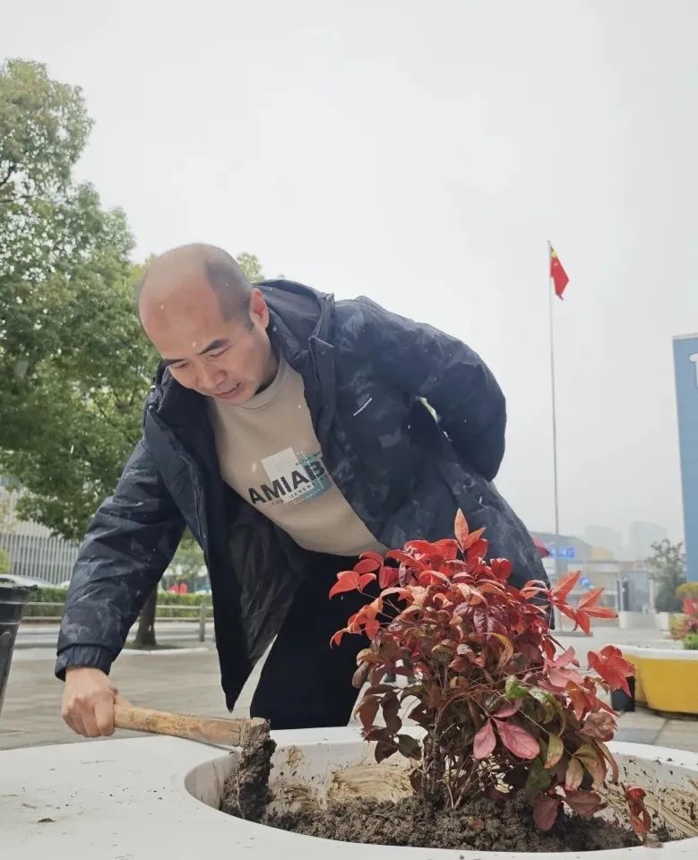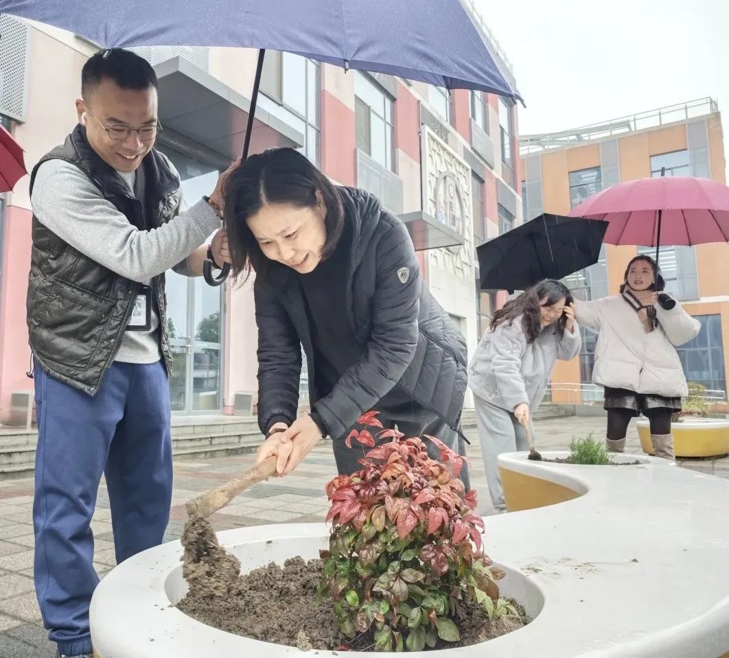 植树节当天,全体教职工同步开展“绿美少年宫”生态共建工程。老师们分组协作,在少年宫北广场家长休息椅旁栽种南天竹、迷迭香等兼具观赏性与实用性的绿植。南天竹四季常青,红果绿叶相映成趣;迷迭香清香宜人,既能净化空气,又能为家长提供舒缓疲惫的氛围。老师们认真规划植株间距,精心培土栽种,将教学育人的细致融入每一道工序。