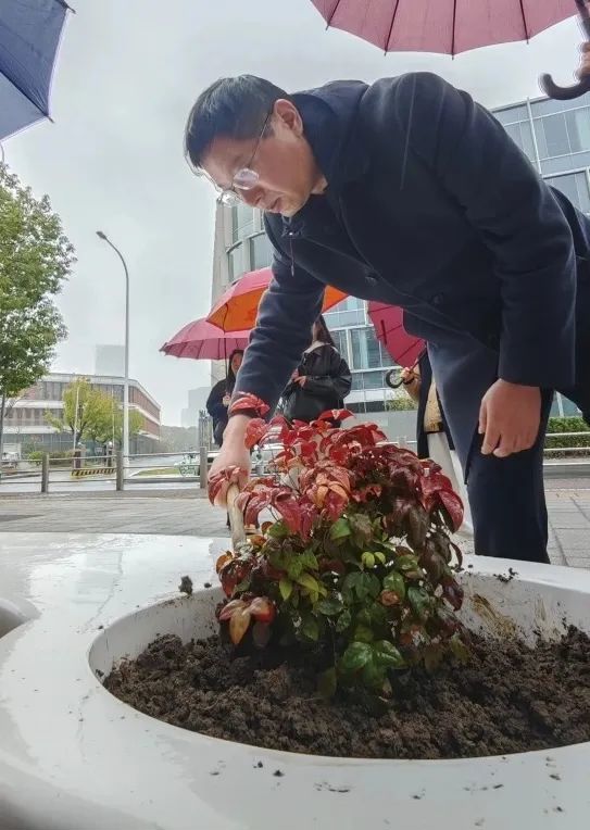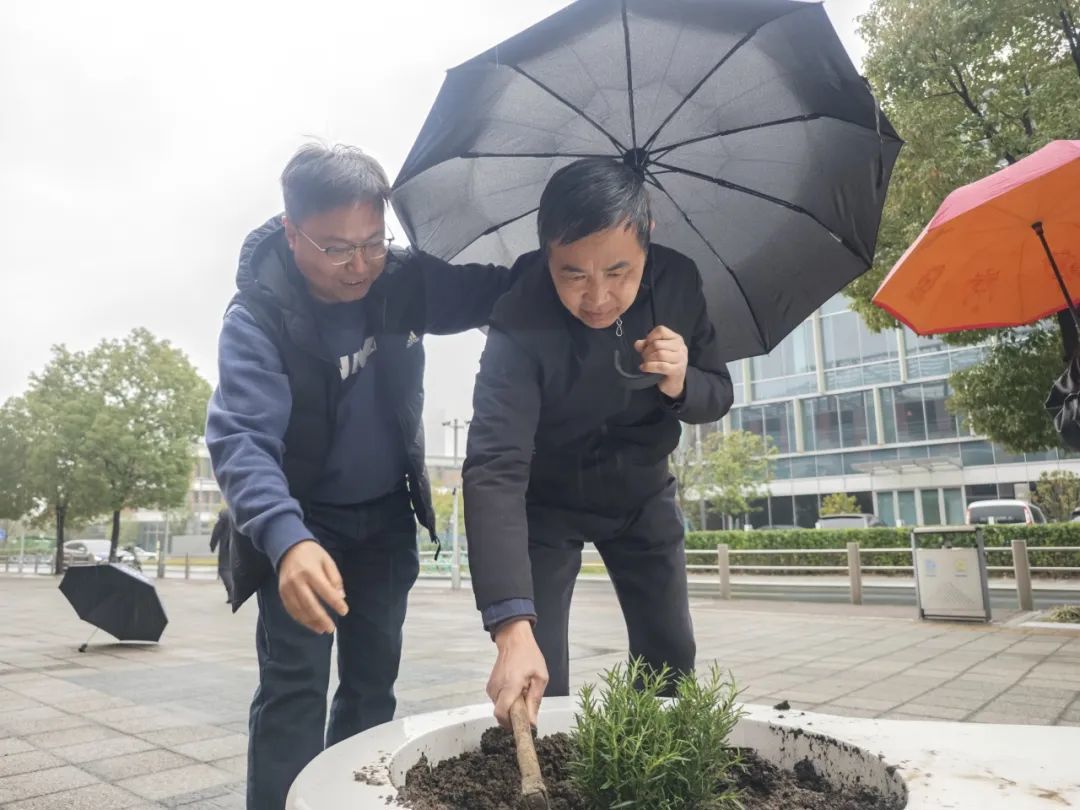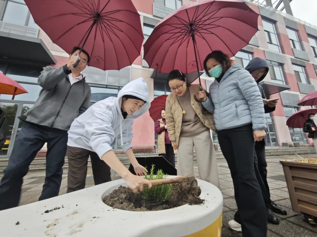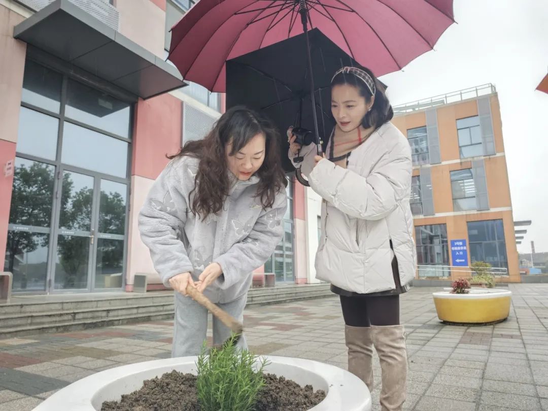 植树节当天,全体教职工同步开展“绿美少年宫”生态共建工程。老师们分组协作,在少年宫北广场家长休息椅旁栽种南天竹、迷迭香等兼具观赏性与实用性的绿植。南天竹四季常青,红果绿叶相映成趣;迷迭香清香宜人,既能净化空气,又能为家长提供舒缓疲惫的氛围。老师们认真规划植株间距,精心培土栽种,将教学育人的细致融入每一道工序。
