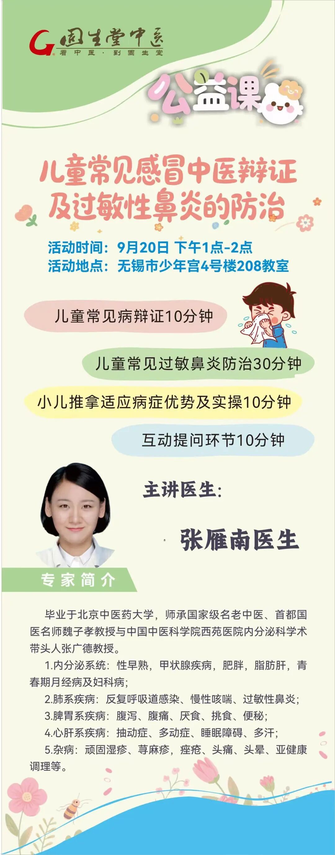 【活动预告】 儿童常见感冒中医辩证及过敏性鼻炎的防治公益讲座活动 ——固生堂名医张雁南传授中医育儿智慧