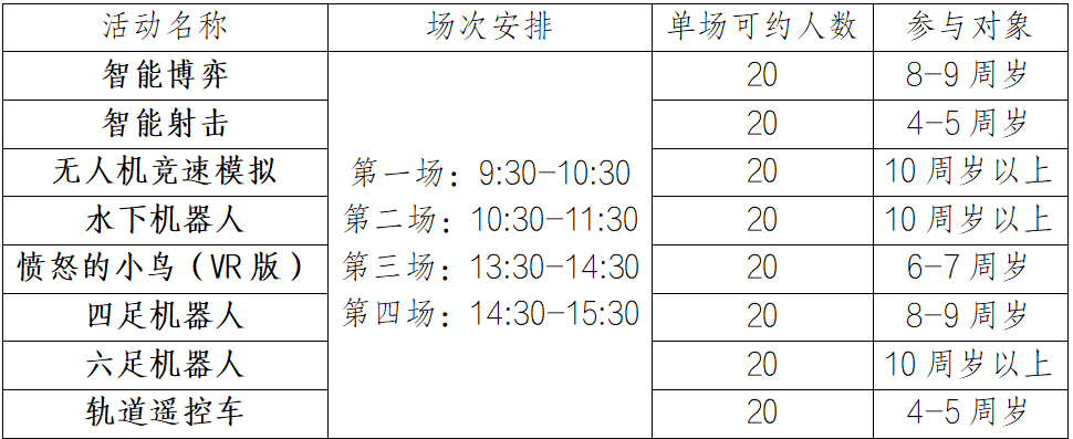 每场 60 分钟,共设 4 场,家长可根据娃的兴趣灵活安排!8 大科技项目各有亮点,保证让孩子挪不开眼:
