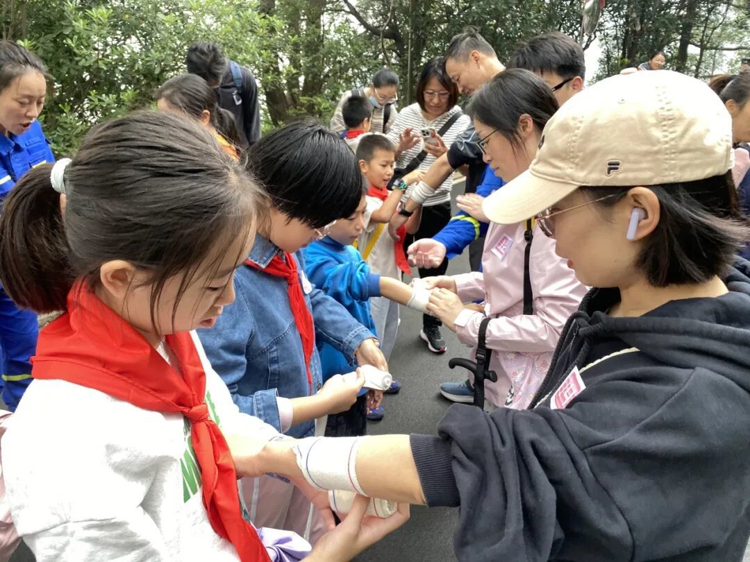 抵达第二打卡点,实战操作开始了。救援队队员模拟了户外活动中可能遇到的擦伤、划伤等情景,手把手地教授大家如何使用绷带进行止血和包扎。家长和孩子互相充当“模特”,认真练习,在互动中掌握了基础的救护技能。