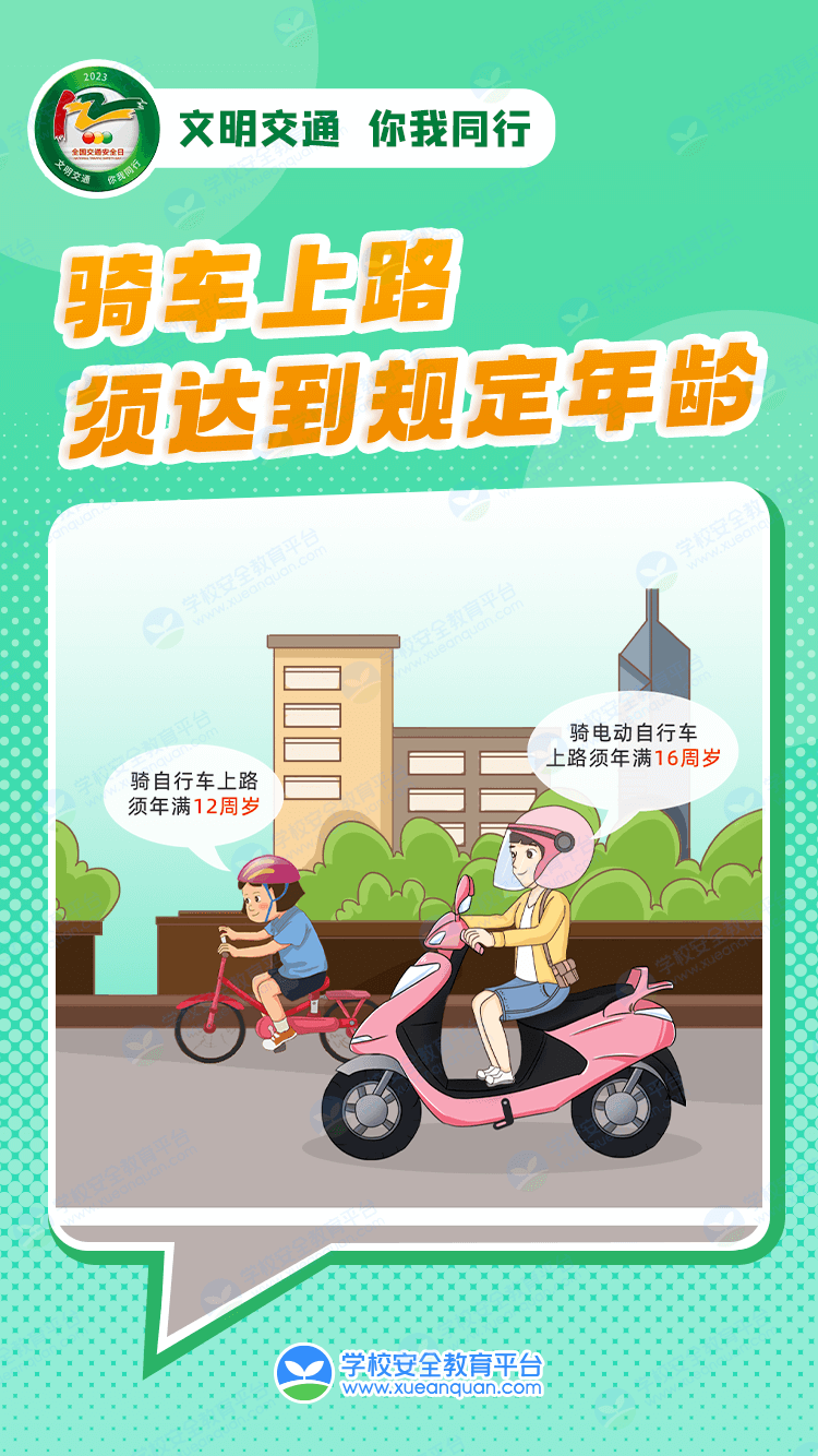 1.未满12周岁不能在道路上骑车,未满16周岁不能在道路上骑电动自行车。