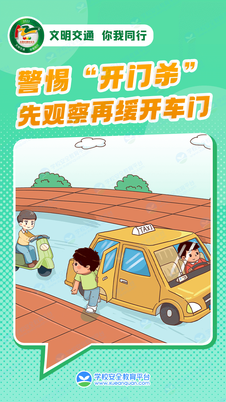 1.等车停稳后再下。开门前,先看一下车周围有没有自行车或摩托车经过,要在没有车辆驶近的情况下再打开门,防止车门突然打开使后面跟上的自行车或摩托车撞上车门而发生意外。