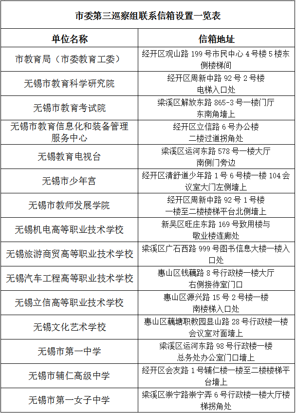 联系信箱:无锡市经开区观山路199号市民中心4号楼5楼东侧楼梯间。市教育局(市委教育工委)各直属事业单位、部分直属学校联系信箱设置地址详见“市委第三巡察组联系信箱设置一览表”。