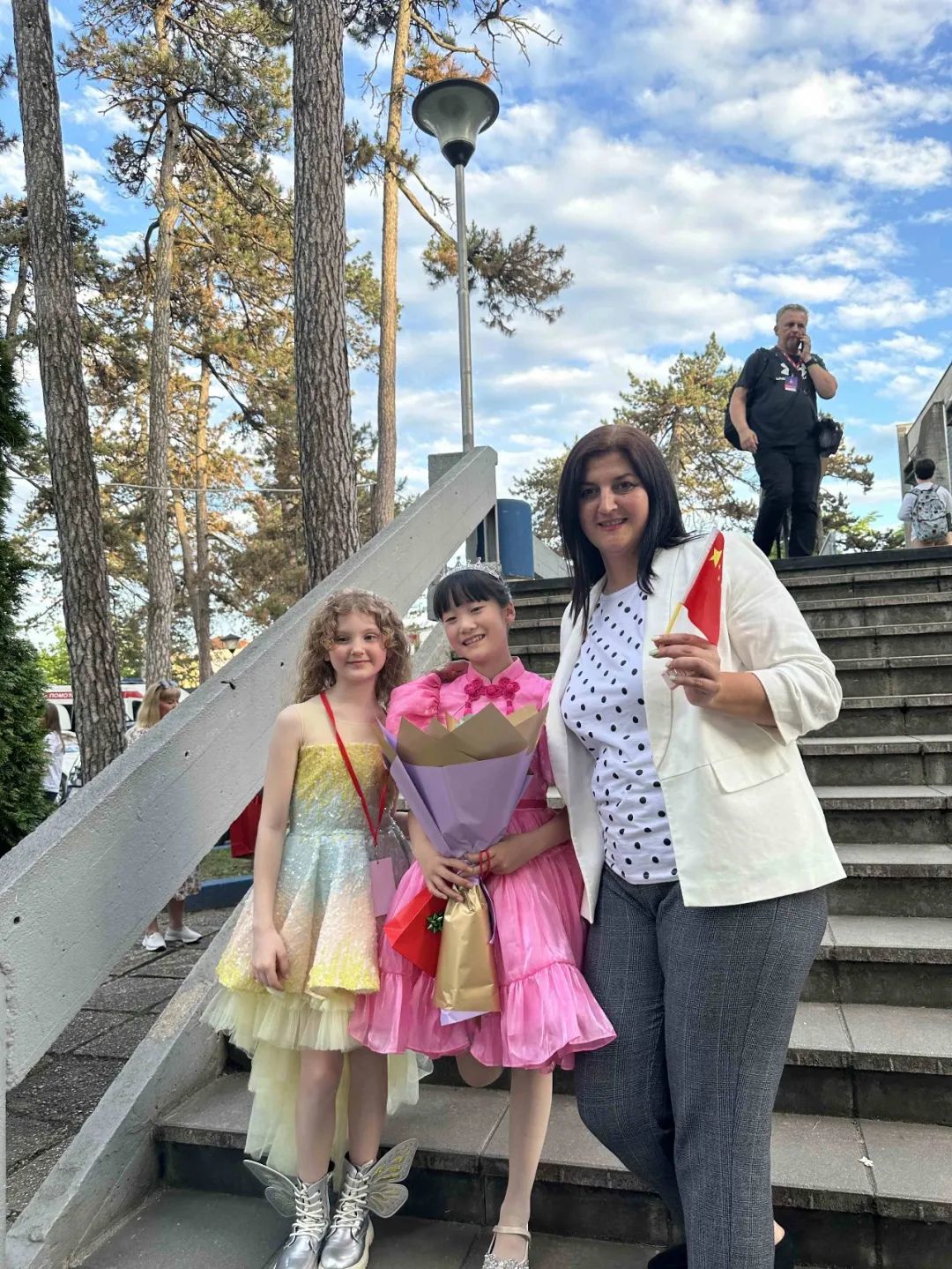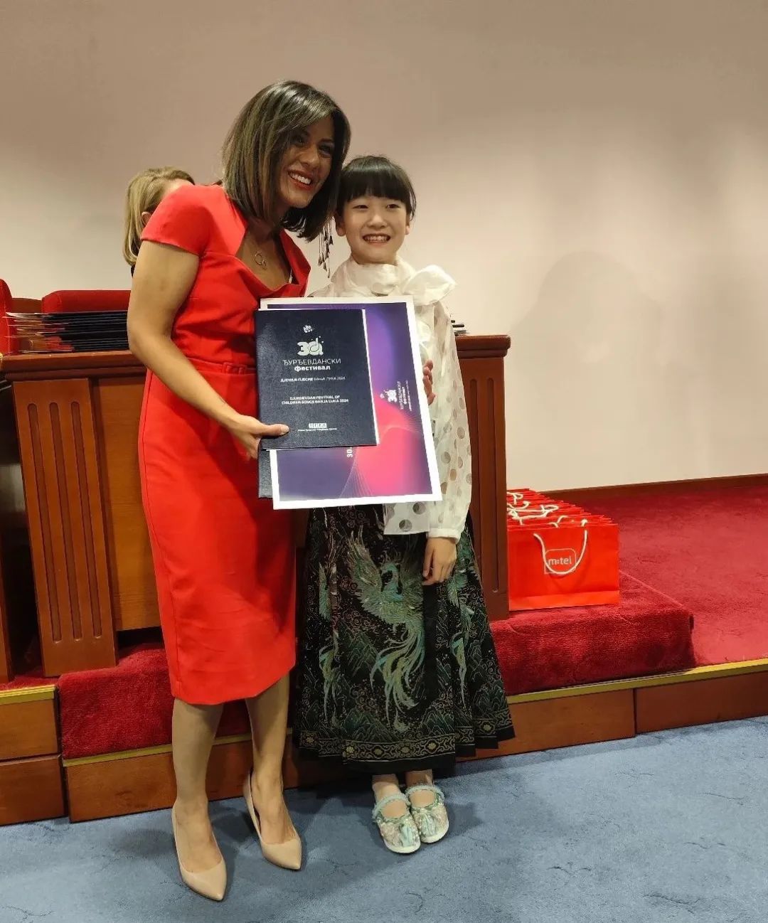 在2024年波黑巴尼亚卢卡圣乔治日国际儿童音乐节上,中国无锡的小选手陆亦凭借出色的表现荣获最佳歌曲演唱奖和总统颁发的外国歌手特殊贡献奖,并受到波黑塞族共和国总统米洛拉德·多迪克的亲切接见和合影留念。此外,中国驻波黑大使馆也特别接见了陆亦并给予了鼓励。