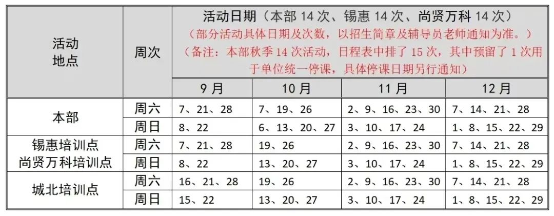 2、城北培训点:开展秋季首次活动(9月16日开展周六活动,9月15日开展周日活动)。
