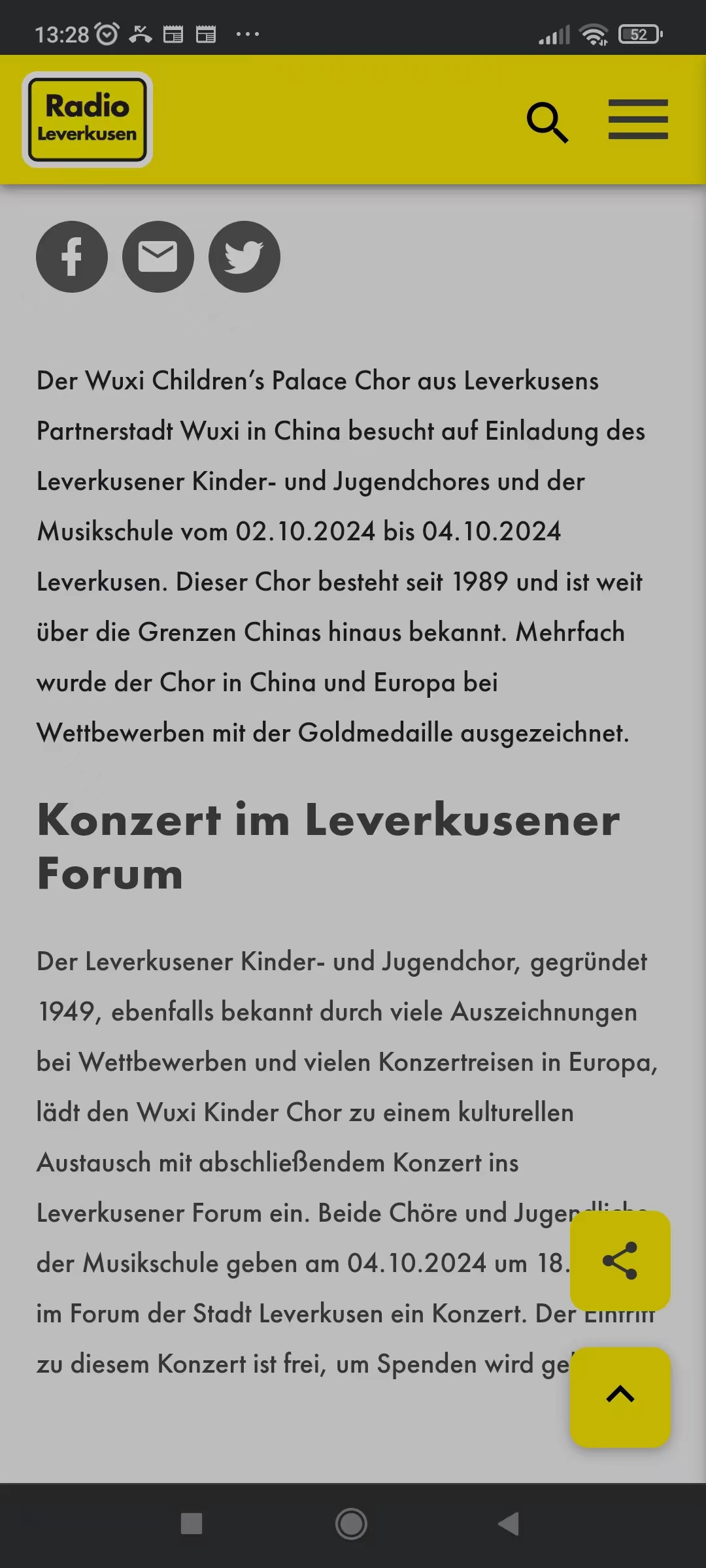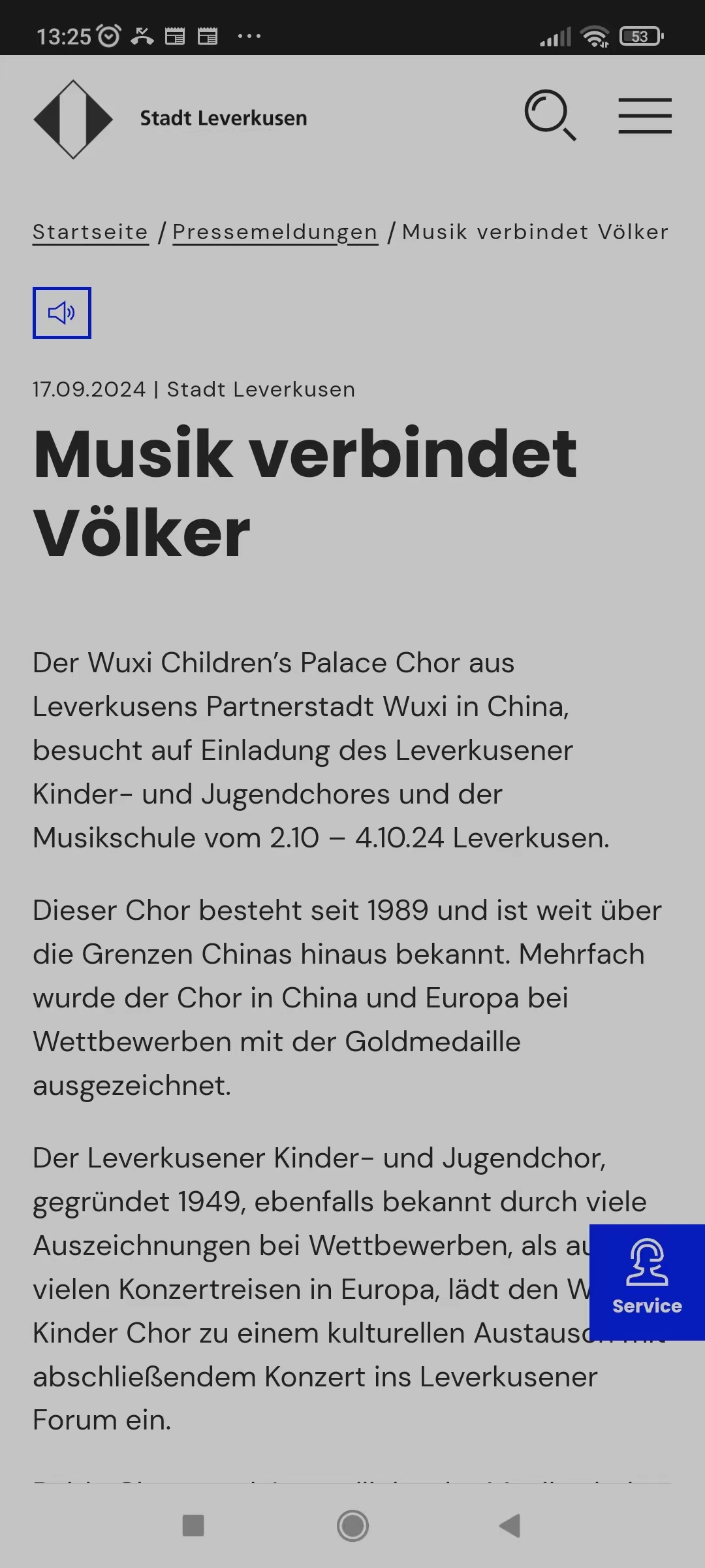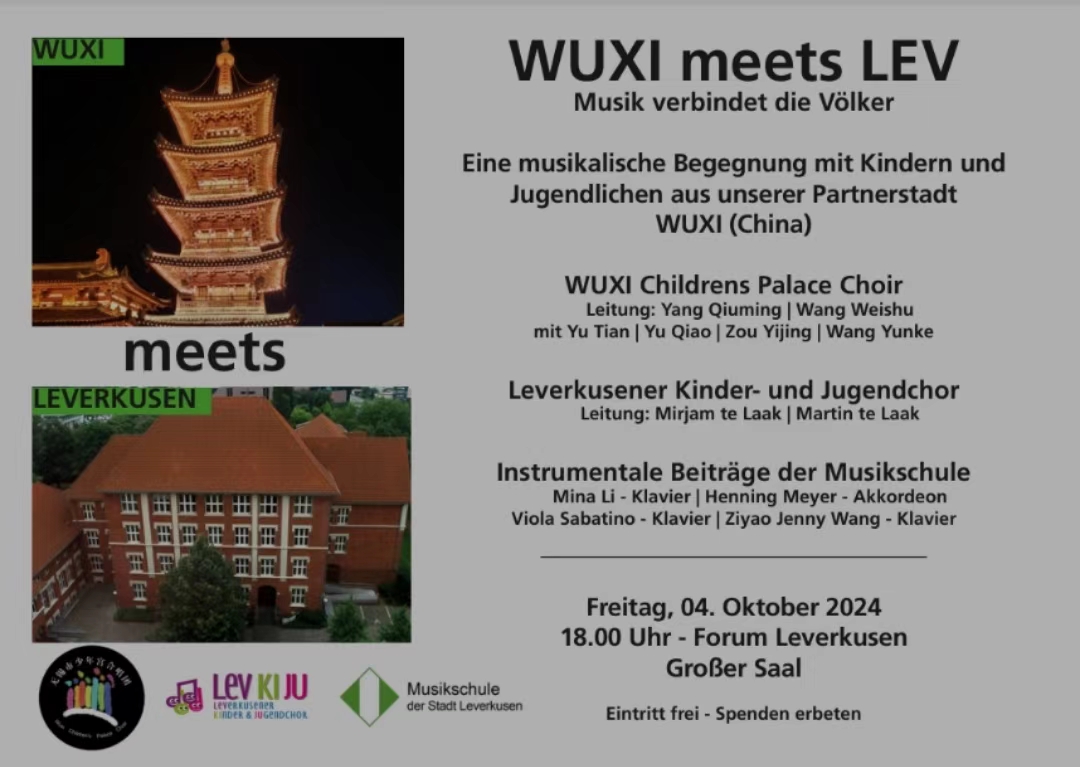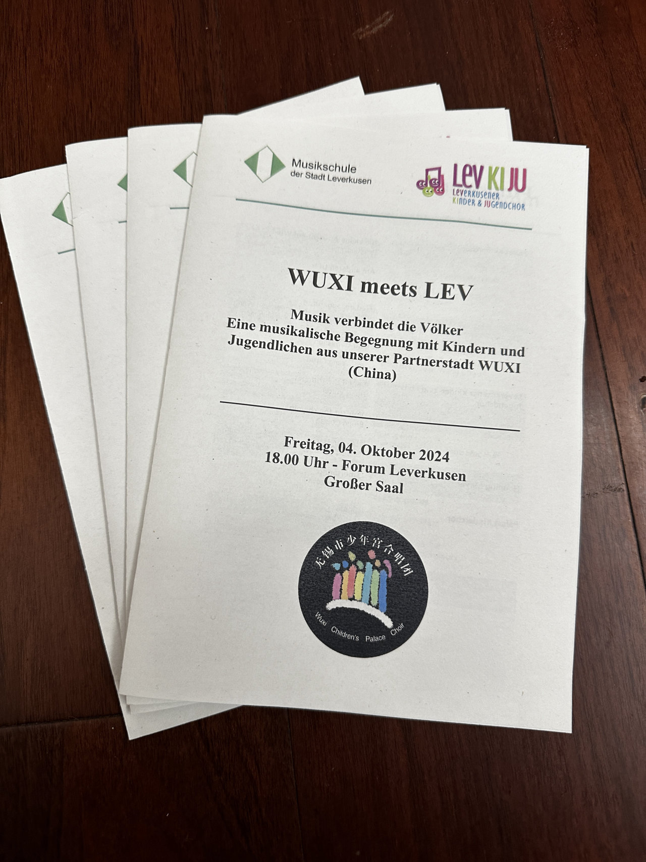 今年恰逢勒沃库森青少年合唱团成立75周年及无锡市少年宫合唱团(成建制)成立 10 周年,两地青少年通过举办庆祝音乐会汇聚一堂,为双方提供了一个绝佳的音乐、文化交流机会,也为两地文化交流搭建了一个良好的平台。早在音乐会举行的前两周,当地政府网站和勒沃库森电台就对音乐会做了提前宣传报道。勒沃库森市副市长本哈德·马雷斯基先生(Bemhard Marewski)在音乐会上发表讲话,他表示,10月1日,中华人民共和国迎来了75周岁生日,在此,向中国客人和中国人民表示热烈的祝贺!他说,2006年他曾跟随勒市代表团到访无锡,留下了深刻印象,非常欢迎无锡市少年宫的孩子们来到勒沃库森,音乐使各国人民走到一起,文化交流促进了不同文化之间的理解和欣赏,并建立跨越国界的持久联系,它们将促进和加强和平共处。无锡-勒沃库森友协现任会长斯文·迈尔-阿伦斯博士(Sven Meyer-Ahrens)协同夫人,已故前会长乔治-迈克尔·鲍尔博士(Georg-Michael Baur) 的夫人安提戈涅·鲍尔博士(Antigone Baur),以及为无锡和勒沃库森文化交流做出巨大贡献的希特萝·迈尔-安格伦(Hiltrud Meier-Engelen)女士及女儿,同友协其他成员也参加了音乐会,并收到了来自无锡外办的礼物和热情的问候!