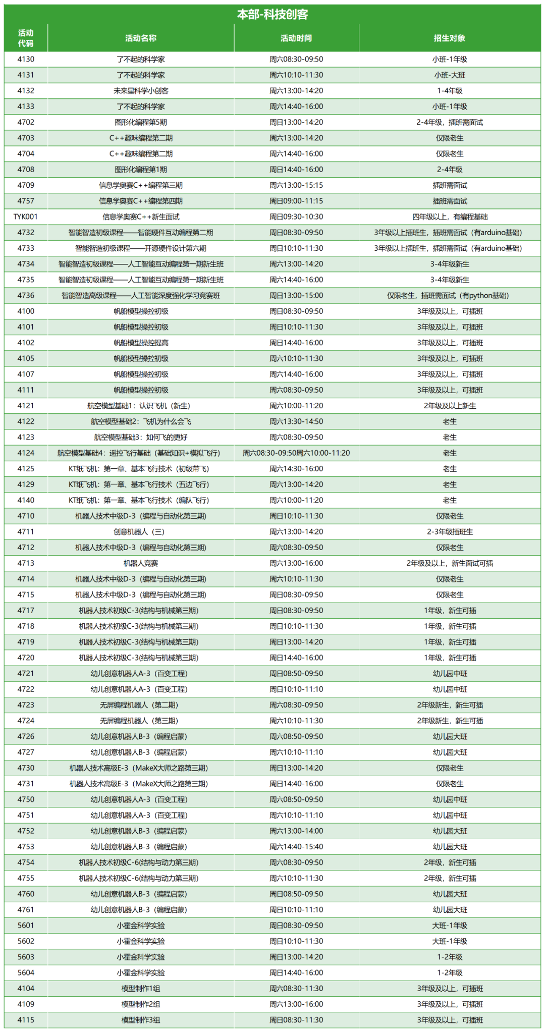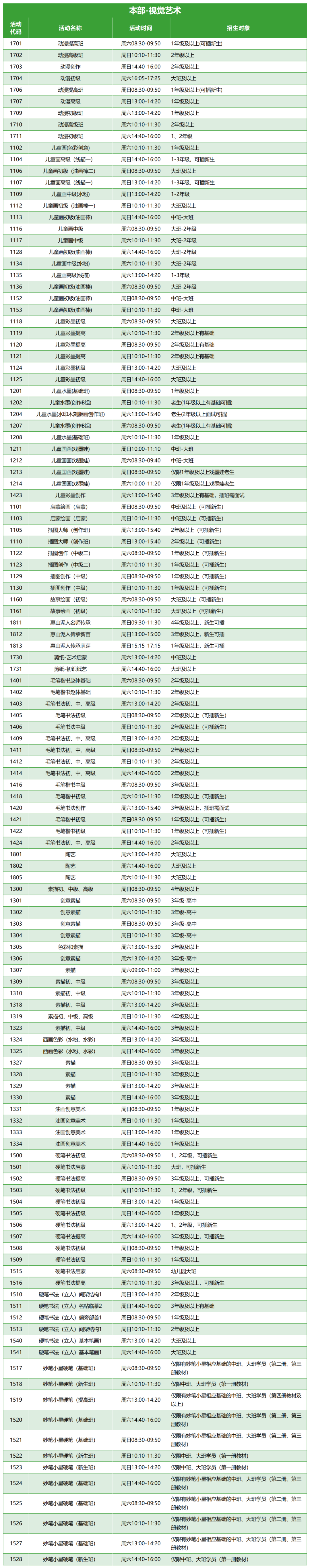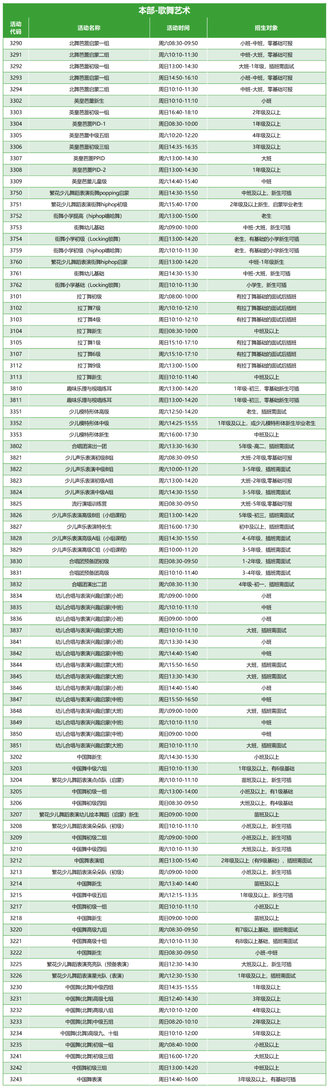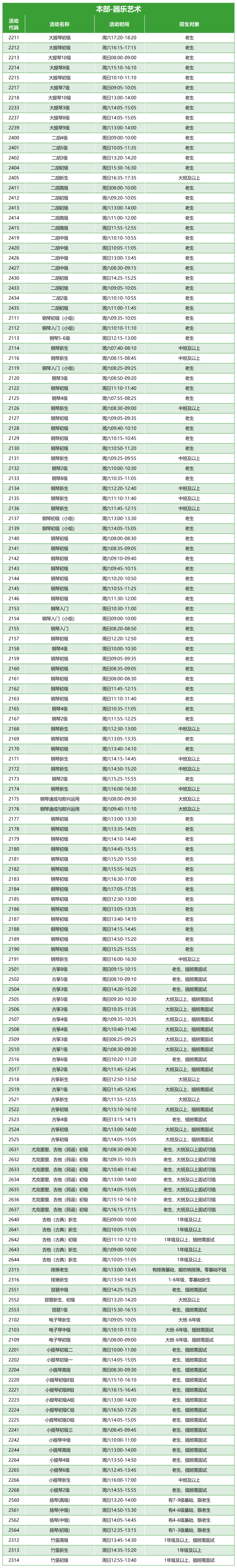 器乐艺术、视觉艺术、歌舞艺术、语言艺术、科技创客、体育运动、益智乐团、生活艺术、营地实践等各类活动、培训。