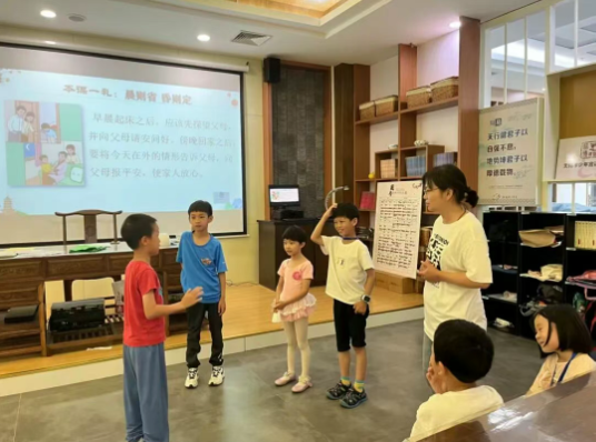自2011年起,无锡市少年宫开设国学经典诵读班,系统构建起以孩子与家长为双主体的育人课堂体系。国学课堂立足浸润和实践模式,围绕感恩、礼仪、诚信等主题,通过经典讲解、德育故事、《弟子规》《论语》力行与课后实践,培养孩子们的行为习惯与道德品格,在其人格奠基阶段厚植立志、好学、仁义的文化基因,铸就终身受益的精神底色。家长课堂则依托国学理念,聚焦亲子教育,通过文化讲解、共同研讨、诵读经典等方式,帮助家长树立正确的教育观,实现校家社协同共育、携手成长。此外还开展了“国学”进学校百场公益讲座,辐射基层服务基层,进一步扩大文化辐射力。
