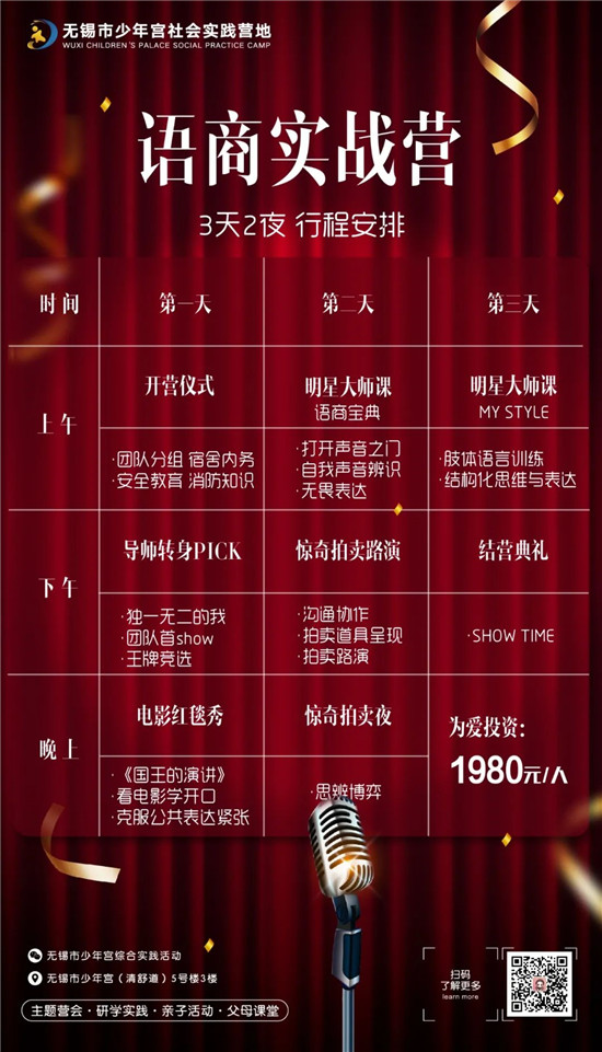 整个营期将采用沉浸式教学方式,打造舞台、红毯、市集、拍卖等真实场景,让孩子能够沉浸在语商表达的仪式感中,让他们通过一次次实战自我修炼。