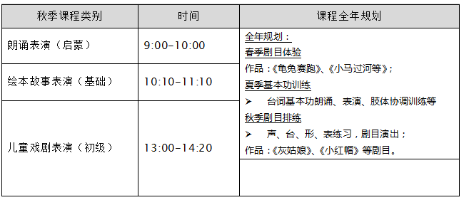 儿童戏剧表演课程通过绘本故事、课本故事、童话故事表演的学习和体验,释放孩子的童真天性,登台表演只是一种汇报形式,但不是学习的目的,儿童戏剧的学习是非功利性的,但却受用一生。