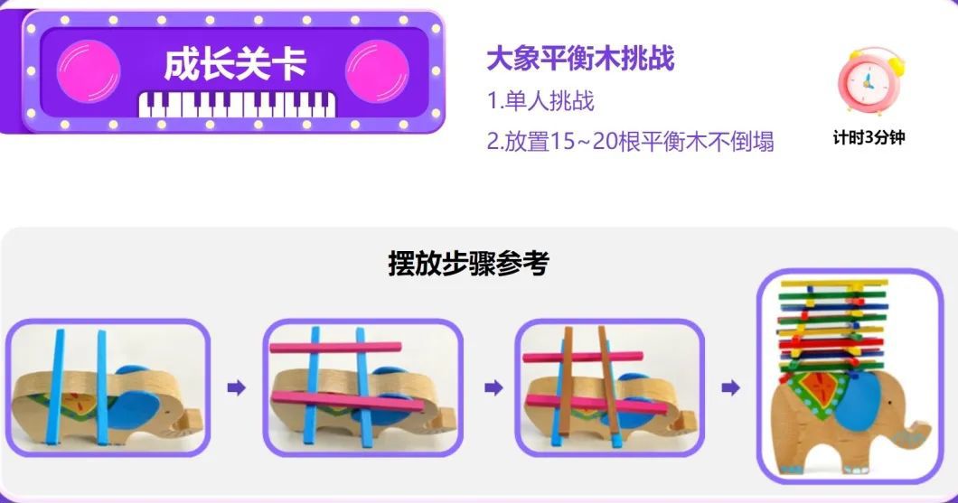 邀请小朋友进行单人挑战,计时在3分钟内放置15-20根平衡木不倒即为游戏胜出,通过游戏,增加活动趣味性的同时锻炼孩子的手眼协调以及专注力。