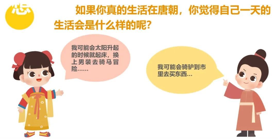 ”如果你是生活在唐朝时期的长安人,你会如何度过一天的生活呢?“邀请小朋友们交流分享,拓展孩子们的想象力,让孩子们敢于自信表达。
