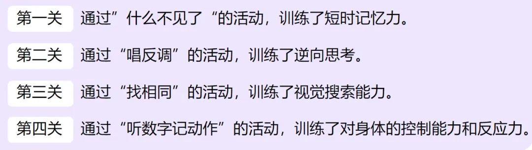 闯关式的活动设计提升孩子们的参与积极性,完成闯关任务,可以获得任务提示及线索,从而完成终极任务,成为本期活动的专注力小达人哦!