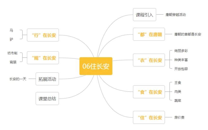 乐舞的曼妙、百戏的喧腾、驰猎的快意、对弈的文雅,以不断丰富的万千气象,最终交融出一抹五彩缤纷的大唐色彩,幻化出一缕独绝古今的长安神韵。绘制“住在长安"思维导图,加深知识点的同时激发孩子们的民族自豪感。