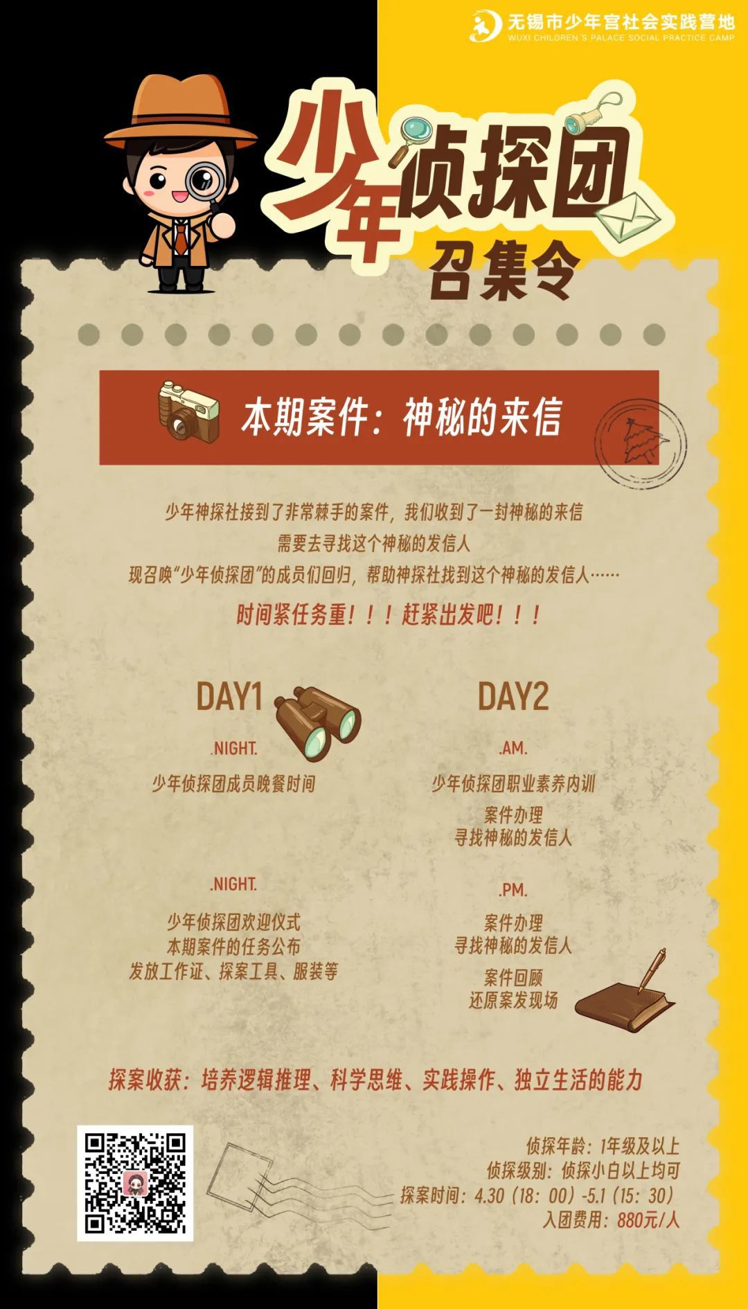 之前营地打造的少年侦探营受到广大小侦探迷们的欢迎。五一开始我们侦探系列将全线升级,打造属于孩子们自己的“侦探少年团”。