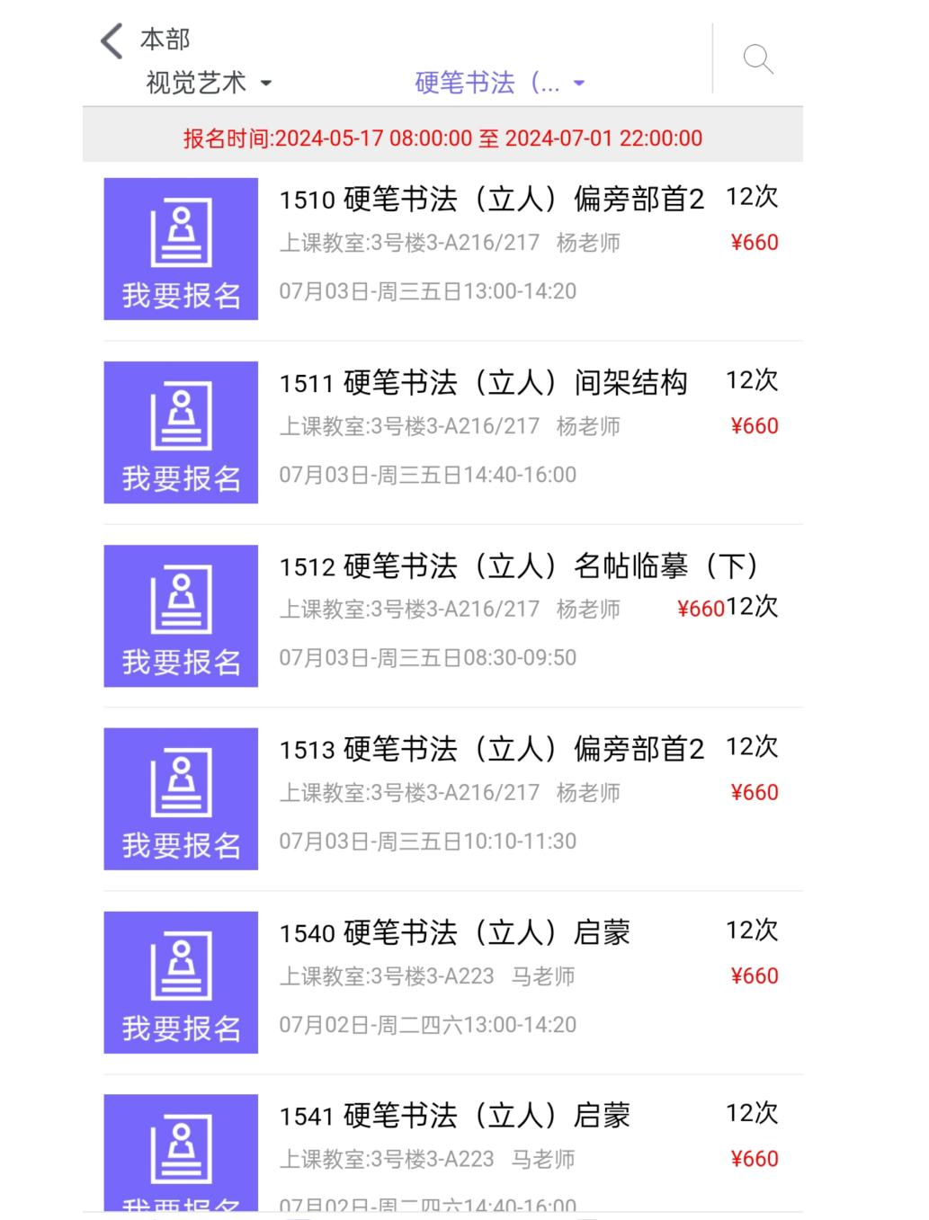 2、在报名系统内点击底部菜单“报名”,在“本部”-“视觉艺术”-“硬笔书法(立人)”内搜索课程。