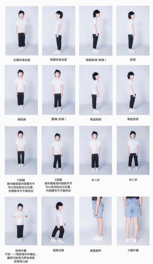 形体改善训练:当今青少年过早接触电子产品、长时间低头作业等让大部分孩子出现形体健康问题,越早改善,伤害越小,长期的形体健康问题,不仅会在生理上带来伤害,更会在孩子的心理路程中带来很深的负面影响,而家长们大部分都不懂得如何帮助孩子们调整形体仪态,所以导致孩子们过早的出现了颈椎错位、含胸驼背、腿部畸形、内外八字脚等(如图所示)形体上的问题。课程通过针对性的教学及动作训练改善孩子形体问题。