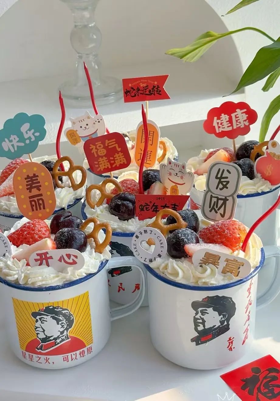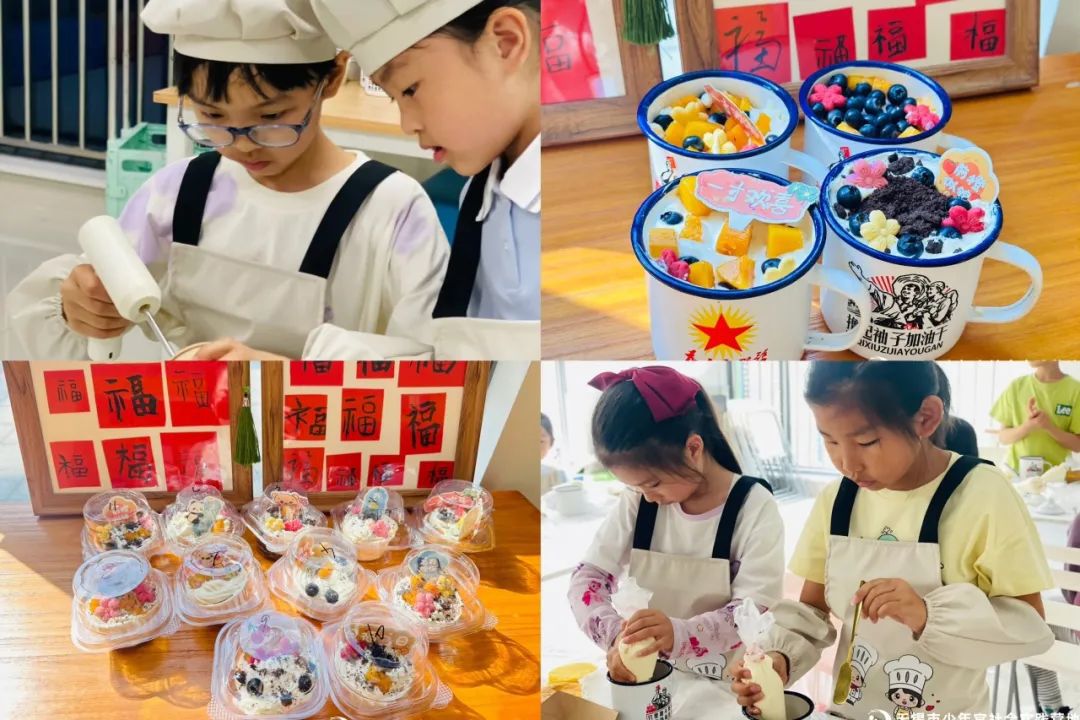 用水果、饼干、卡片等装饰搪瓷杯,打造专属“劳动勋章蛋糕”,还可以将自己做的蛋糕带回家哦~