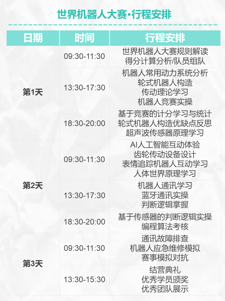根据备赛法则,以及导师的指导经验,本次世界机器人大赛集训营内容设计时长为3天2晚,具体安排如下: