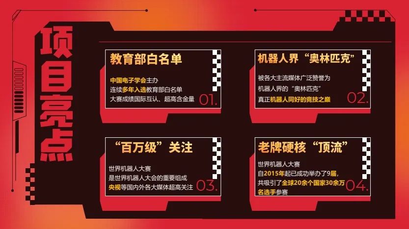 由工信部中国电子学会主办的世界机器人大赛自2015年起已成功举办了九届,共吸引了全球20余个国家20万余名选手参赛,被各大主流媒体广泛赞誉为机器人界的“奥林匹克”,是目前国内外影响广泛的机器人领域官方专业赛事。