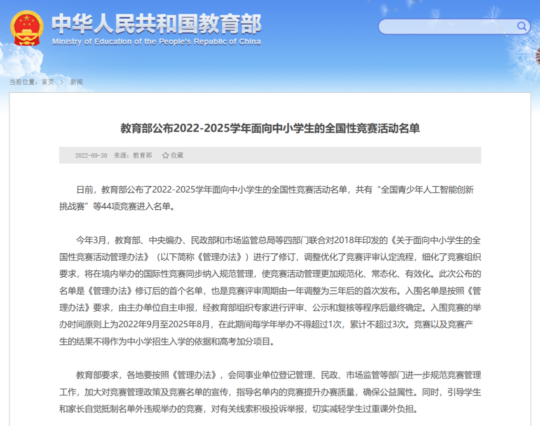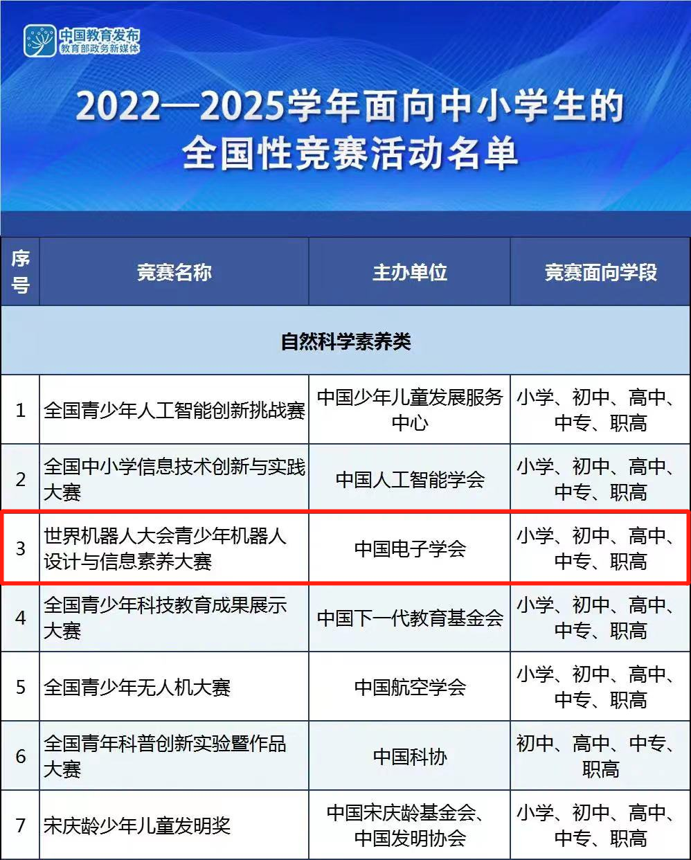 2021年9月初,教育部正式公布《2021-2022年度面向中小学生的全国性竞赛活动名单》,世界机器人大赛已经获得教育部官方认可,在国家推行“强基计划”的背景下,世界机器人大赛更显重要,赛事成绩纳入中高考综合素质评价体系。