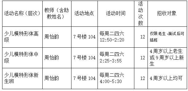 模特舞台表演训练:通过专业练习,塑造出挺拔的站姿、坐姿、走姿以外,同时通过镜前表演训练、音乐节奏训练、眼神表情训练、颜色服装搭配练习等,让孩子们参与课外秀场表演、广告拍摄等活动,让孩子增加社会经历,开拓眼界,通过外在表现、内外提升、社会美育经历与老师的引导提升孩子的气质,建立孩子自信心,提高审美,增强孩子的从容性,在人生道路上或许会有困难,但依然内心强大,从容不迫。
