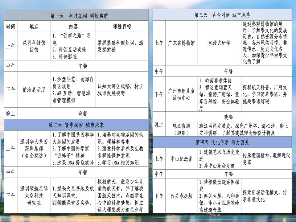 ·以“科创赋能·文化铸魂”为内核,通过探访深圳尖端科技场馆、名企与领略广州城市地标、文化遗址的深度研学,融合科技实践、历史探究、城市发展三大维度。