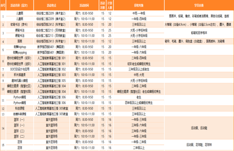 无锡市少年宫学生核心素养培育基地(尚贤万科教学点)2025年秋学期活动时间为2025年9月13日至2026年1月17日,共计15类课程,共开设25门活动项目。