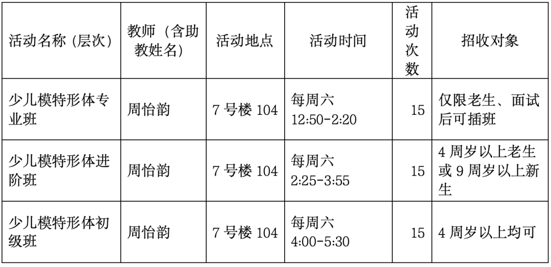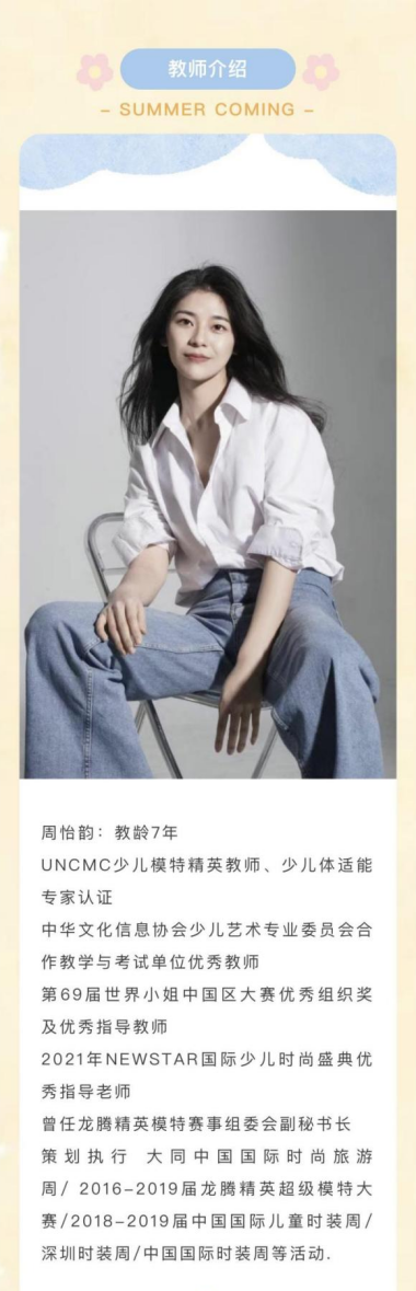通过专业练习,塑造出挺拔的站姿、坐姿、走姿以外,同时通过镜前表演训练、音乐节奏训练、眼神表情训练、颜色服装搭配练习等,让孩子们参与课外秀场表演、广告拍摄等活动,让孩子增加社会经历,开拓眼界,通过外在表现、内外提升、社会美育经历与老师的引导提升孩子的气质,建立孩子自信心,提高审美,增强孩子的从容性,在人生道路上或许会有困难,但依然内心强大,从容不迫。