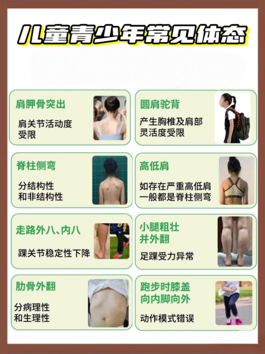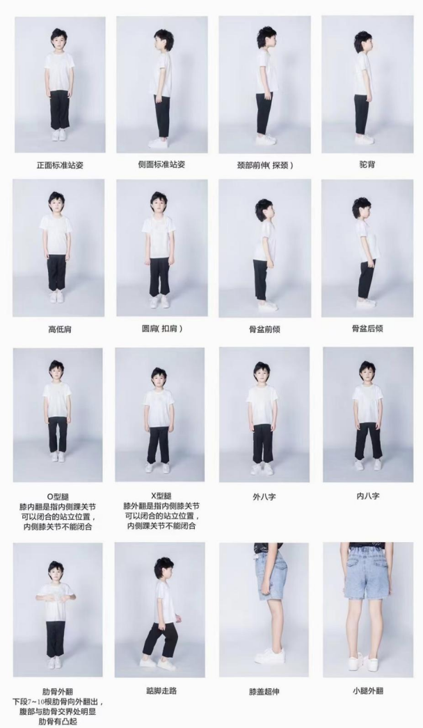 当今青少年过早接触电子产品、长时间低头作业等让大部分孩子出现形体健康问题,越早改善,伤害越小,长期的形体健康问题,不仅会在生理上带来伤害,更会在孩子的心理路程中带来很深的负面影响,而家长们大部分都不懂得如何帮助孩子们调整形体仪态,所以导致孩子们过早的出现了颈椎错位、含胸驼背、腿部畸形、内外八字脚等(如图所示)形体上的问题。课程通过针对性的教学及动作训练改善孩子形体问题。