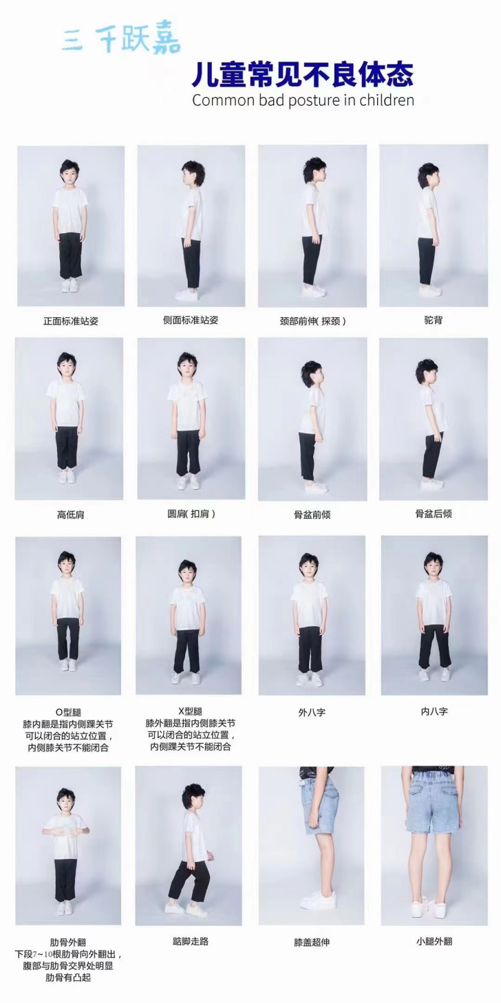 模特形体教学分为两部分:形体改善训练:当今青少年过早接触电子产品、长时间低头作业等让大部分孩子出现形体健康问题,越早改善,伤害越小,长期的形体健康问题,不仅会在生理上带来伤害,更会在孩子的心理路程中带来很深的负面影响,而家长们大部分都不懂得如何帮助孩子们调整形体仪态,所以导致孩子们过早的出现了颈椎错位、含胸驼背、腿部畸形、内外八字脚等(如图所示)形体上的问题。课程通过针对性的教学及动作训练改善孩子形体问题。模特仪态训练:通过专业练习,塑造出挺拔的站姿、坐姿、走姿,让孩子养成一个良好的形体习惯,参与课外秀场等活动让孩子增加社会经历,开拓眼界,通过外在表现、内外提升、社会美育经历与老师的引导提升孩子的气质,建立孩子自信心,提高审美,增强孩子的从容性,在人生道路上或许会有困难,但依然内心强大,从容不迫。这就是一个好的结果!