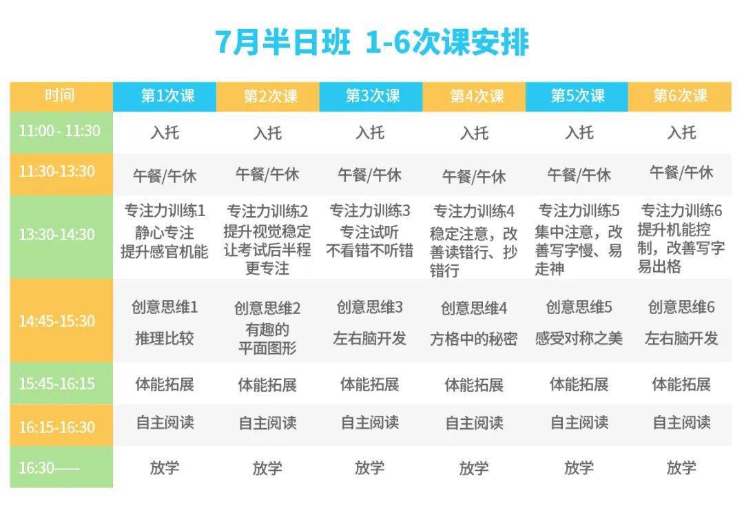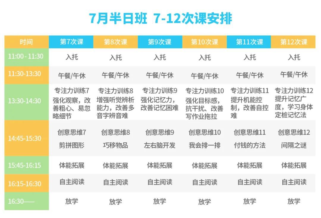 积极成长营7月半日班,分为双日班(二四六开课)和单日班(三五日开课),可以任选一期报名即可,共开设12次课,具体课程安排见下图