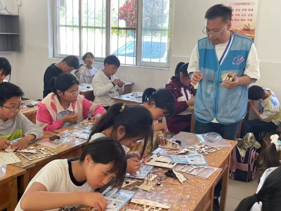 随后,老师们走进各个班级,指导孩子们开展了科学技术、人工智能、娱乐文体等体验项目。孩子们在志愿老师的指导下大展风采,小台灯、光纤灯、八音盒……灵巧的双手做出大大的惊喜。活动拓展了孩子们的科学视野,引领他们踏上了一段充满惊喜与启迪的科技之旅,在孩子们的心中种下了一颗颗希望的种子。