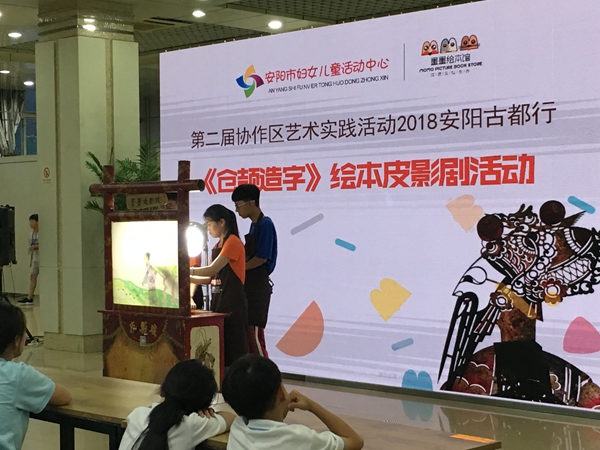 观看安阳市妇女儿童活动中心“墨墨绘本馆”的老师表演 《仓颉造字》绘本皮影剧;