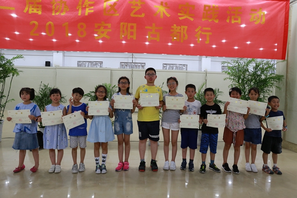 继去年暑期在无锡举办首届多元化艺术课程实践活动后,今年第二届艺术实践活动于7月21日在古都安阳开营。无锡市少年宫作为中国儿童视觉艺术创新教育协作区发起单位,组织少儿书画院学生走出课堂,走进古都安阳,与来自中国儿童中心、天津市少年宫、广州儿童活动中心、江苏省妇女儿童活动中心、景德镇市青少年宫的100多名少年儿童一起学习交流,感受中原文化,展现艺术风采。